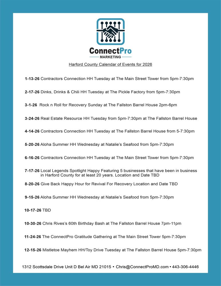 ConnectPro offers a powerful platform to grow your brand in Harford and Cecil County by leveraging its active Facebook presence and the extensive network of its founder, Chris Rives. Through targeted social media strategies, ConnectPro can amplify your brand's visibility, engage with the local community, and foster meaningful connections. Chris Rives' established reputation and wide-reaching influence further enhance these efforts, creating opportunities for collaboration, referrals, and increased brand recognition in the region. Together, these elements make ConnectPro a valuable partner in expanding your reach and impact locally.