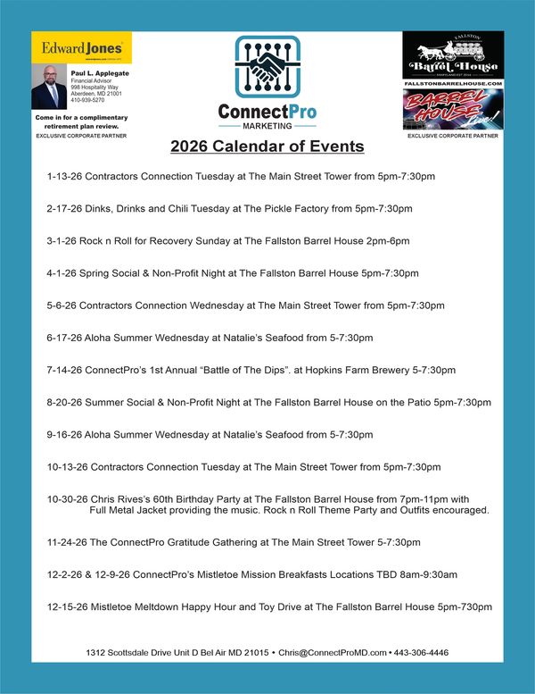 ConnectPro offers a powerful platform to grow your brand in Harford and Cecil County by leveraging its active Facebook presence and the extensive network of its founder, Chris Rives. Through targeted social media strategies, ConnectPro can amplify your brand's visibility, engage with the local community, and foster meaningful connections. Chris Rives' established reputation and wide-reaching influence further enhance these efforts, creating opportunities for collaboration, referrals, and increased brand recognition in the region. Together, these elements make ConnectPro a valuable partner in expanding your reach and impact locally.